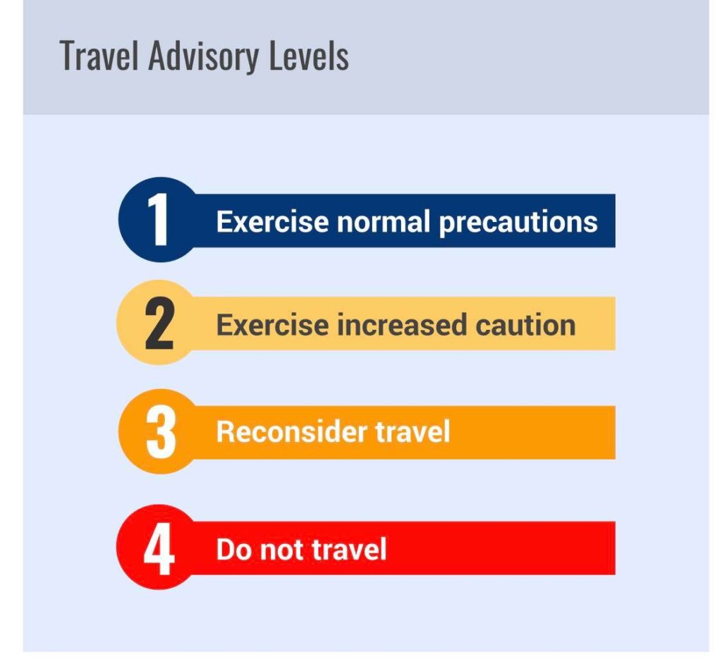 ويمثل اللون الأحمر المستوى الرابع من الخطورة، وأشارت مكتب القنصلية العامة للحكومة الأمريكية في آخر تحديث لها، إلى خطر الإرهاب، الإختطاف والأزمة الصحية “كوفيد19”.