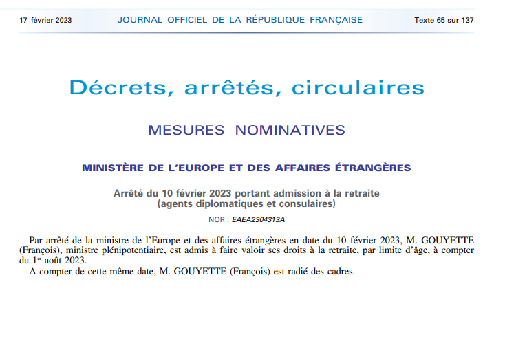 وبحسب القرار فأنه “بأمر من وزير أوروبا والشؤون الخارجية، مؤرخ في 10فيفري الجاري، يسمح لفرانسوا غويات الوزير المفوض المطالبة بحقوقه التقاعدية، بحدود العمر، اعتبارًا من تاريخ 31 أوت 2023”.