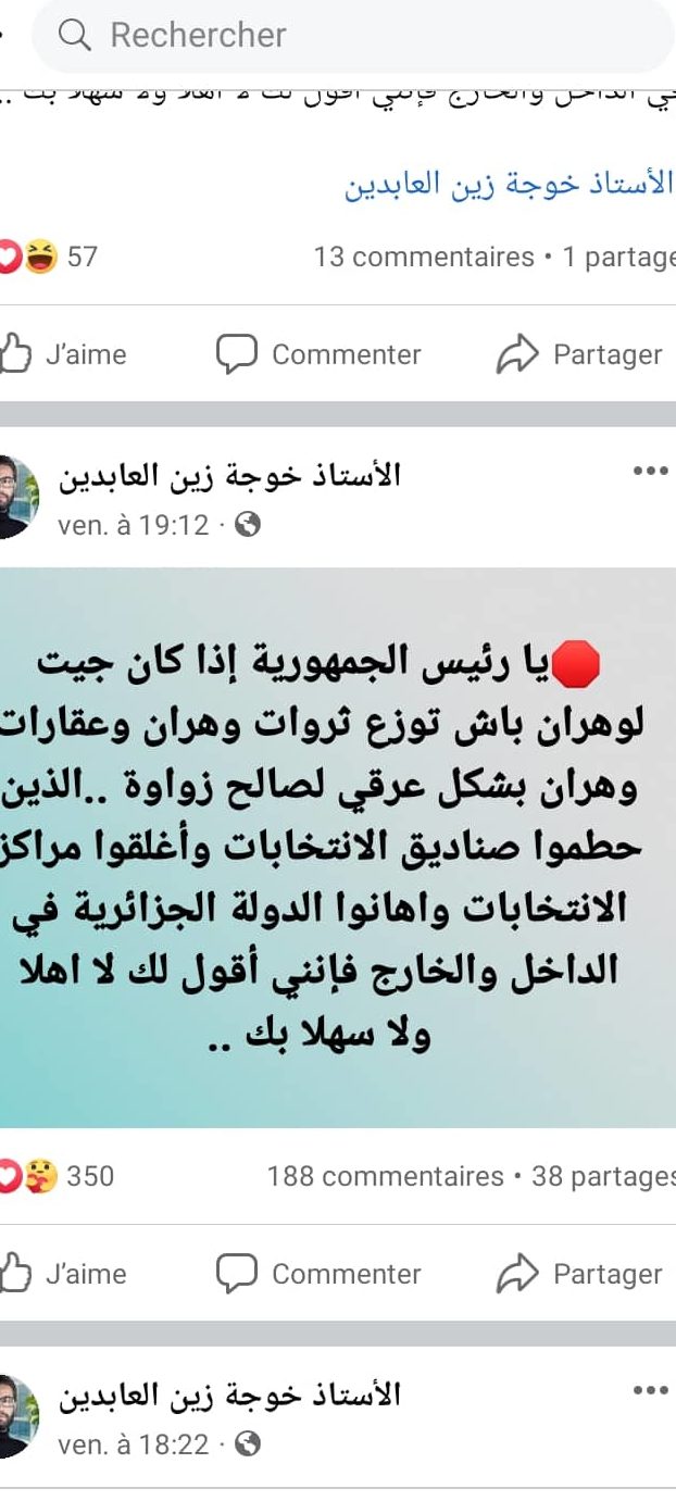 وكان المتهم قد اتهم، الرئيس عبدالمجيد تبون ب”توزيع ثروات وهران وعقاراتها بشكل عرقي على امازيغ منطقة القبائل من الذين حطموا صناديق الانتخابات” خلال زيارته لوهران، مخاطبا عبر عدد من المنشورات بالقول ” لا اهلا ولا سهلا بك”، مقابل منشورات أخرى عنصرية ضد الثقافة والثرات الامازيغي.