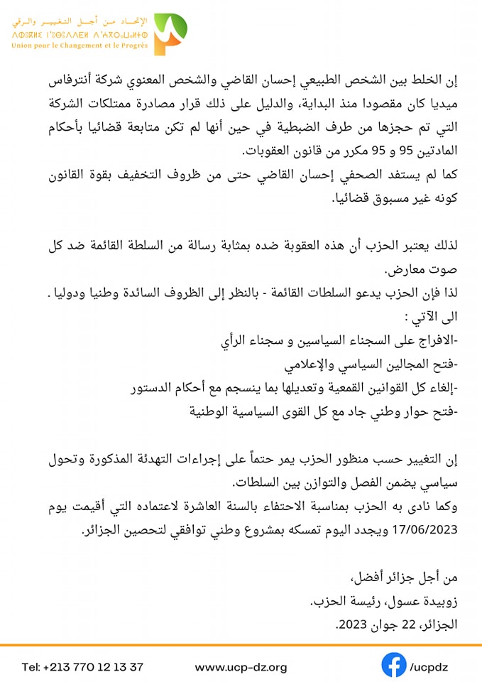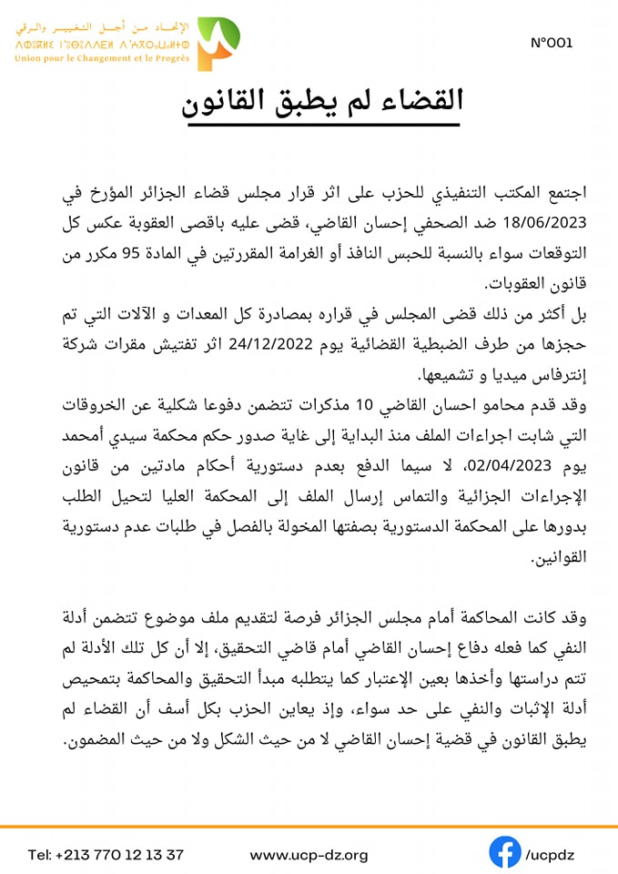 قال حزب الاتحاد من أجل التغيير والرقي، خلال اجتماع مكتبه التنفيذي، أول أمس، أن “القضاء لم يطبق القانون في قضية الصحفي القاضي إحسان”.