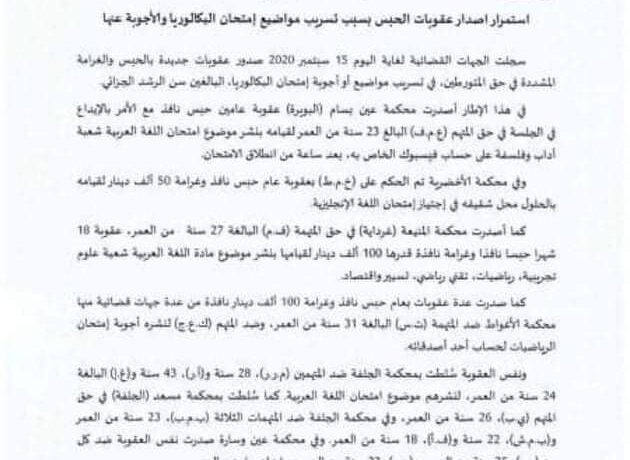 ووفق بيان لوزارة العدل يحوز ” راديو ام” نسخة منه، أصدرت محكمة عين بسام (البويرة) عقوبة عامين حبس نافذ مع الأمر بالإيداع في الجلسة في حق المتهم (ع.م.ف) البالغ 23 سنة من العمر لقيامه بنشر موضوع امتحان اللغة العربية شعبة آداب وفلسفة على حساب فيسبوك الخاص به، بعد ساعة من انطلاق الامتحان.وفي محكمة الأخضرية تم الحكم على (خ.م.ط) بعقوبة عام حبس نافذ وغرامة 50 ألف دينار لقيامه بالحلول محل شقيقه في إجتياز إمتحان اللغة الإنجليزية.كما أصدرت محكمة المنيعة (غرداية) في حق المتهمة (ف.م) البالغة 27 سنة من العمر، عقوبة 18 شهرا حبسا نافذا وغرامة نافذة قدرها 100 ألف دينار لقيامها بنشر موضوع مادة اللغة العربية شعبة علوم تجريبية، رياضيات، تقني رياضي، تسيير واقتصاد.