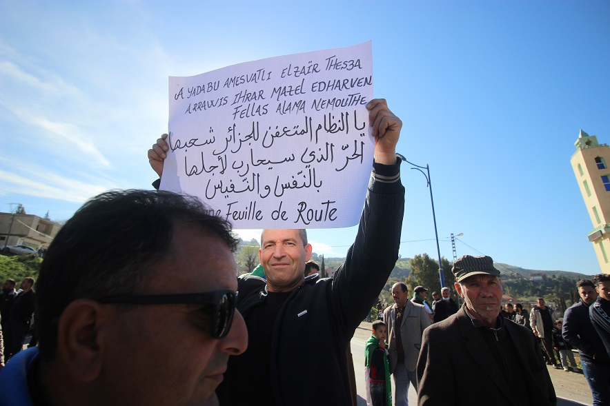 رفع المعارض السياسي وسجين الرأي السابق عبد الكريم زغيليش لافتة تؤكّد على ضرورة تنظيم الحراك وهو الأمر الذي استحسنه المشاركون في مسيرة خراطة.