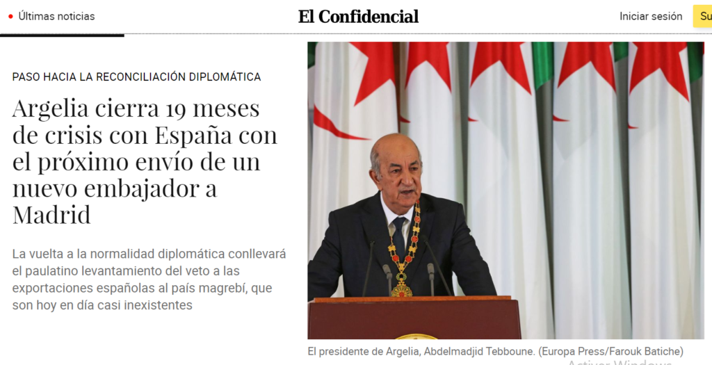 كشف صحيفة “أل كوفيدونسيال” الإسبانية، نقلاً عن مصادر وصفتها بـ”المطلعة على العلاقات الثنائية” بين الجزائر واسبانيا، أن السلطات الجزائرية تستعد لإرسال سفيرها إلى إسبانيا ، مايعني نهاية الأزمة الثنائية التي دامت 19 شهرًا، بسبب رسالة رئيس الحكومة الإسبانية بيدرو سانشيز إلى ملك المغرب محمد السادس.