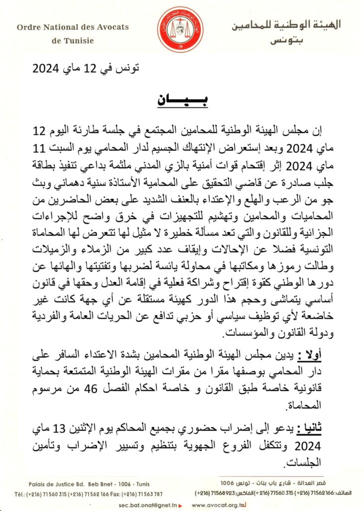 قرر مجلس الهيئة التونسية للمحامين المنعقد في جلسة طارئة أمس الأحد ، تنظيم يوم غضب وطني أمام قصر العدالة بتونس تتخلله وقفة احتجاجية يوم الخميس 16 من هذا الشهر، مع مقاطعة التعامل النيابة والفرق الأمنية ثلاثة أيام الثلاثاء، الأربعاء والخميس 14، 15 و16 ماي 2024.