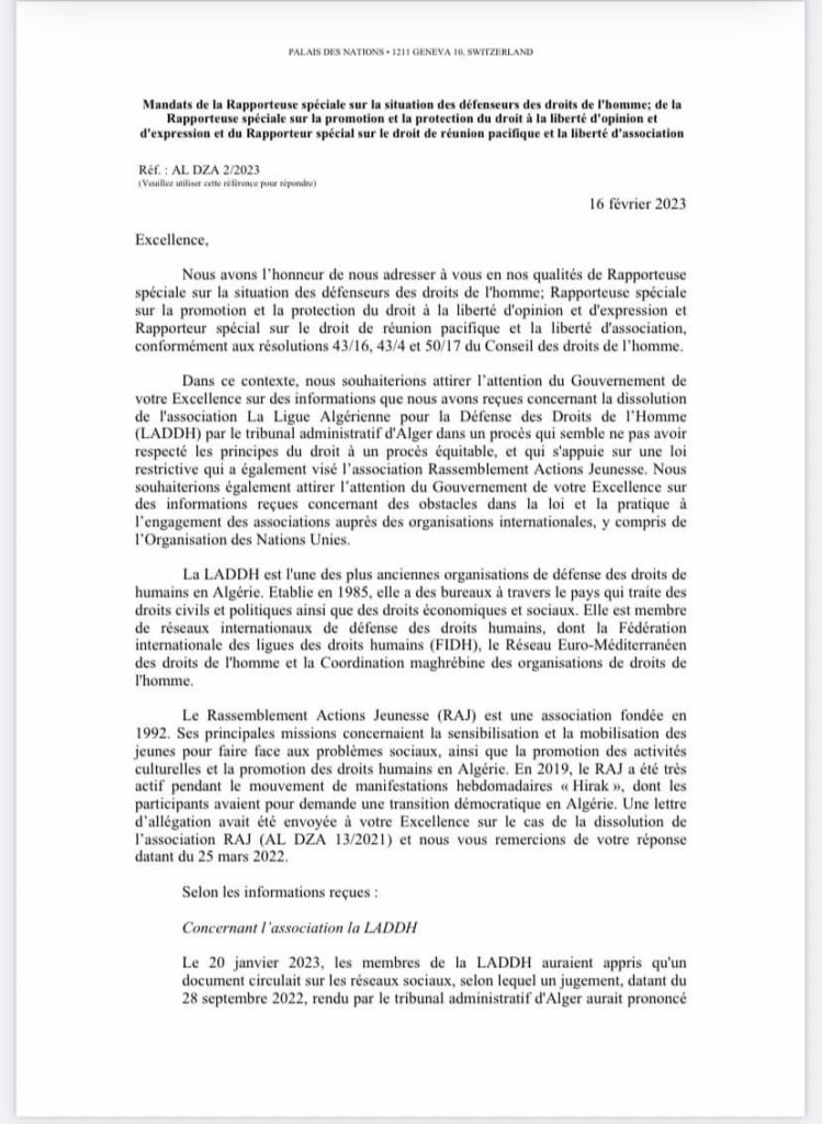 وبتاريخ 16 فيفري 2023 راسلت المقررة الأممية المعنية بحالة المدافعين عن حقوق الانسان ، والمقررة الخاصة حول حرية الرأي والتعبير، و المقرر الخاص بحرية التجمع السلمي وحرية الجمعيات الحكومة الجزائرية بخصوص قرار حل الرابطة الجزائرية للدفاع عن حقوق الانسان وحل جمعية راج .