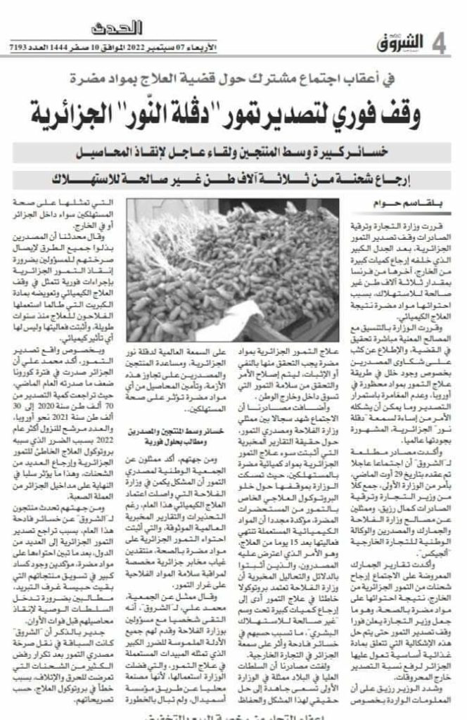 وتناول مقال الصحفي بلقاسم حوام ، قرار لوزارة التجارة ب” وقف تصدير تمور دقلة نور بعد ارجاع 3 آلاف طن غير صالحة للاستهلاك من فرنسا، بسبب احتوائها مادة مضرة بسبب العلاج الكيميائي”.