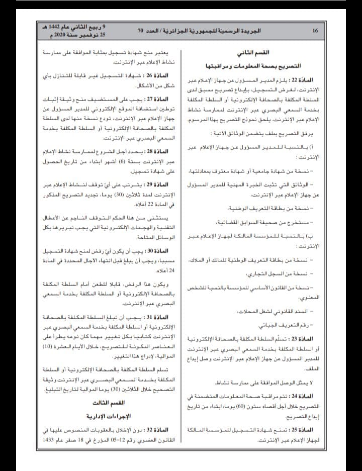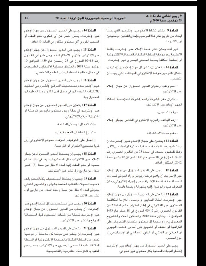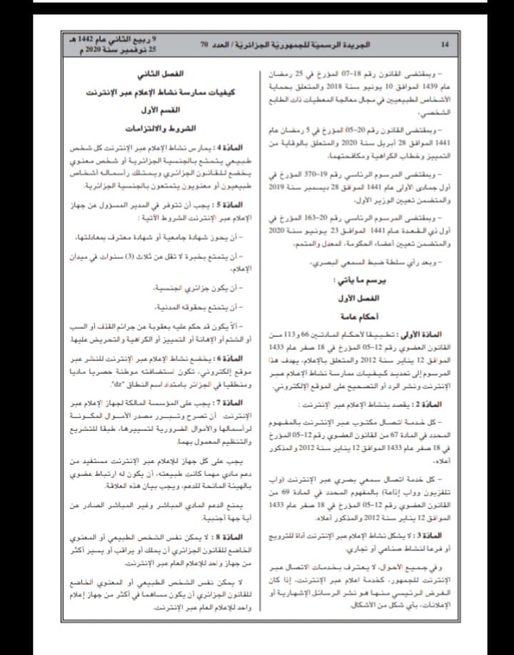 صدر المرسوم التنفيذي للصحافة الإلكترونية وكيفيات ممارسة نشاط الإعلام عبر الإنترنت، في العدد الأخير من الجريدة الرسمية في عددها الـ 70، والمؤرخة في 25 نوفمبر 2020.