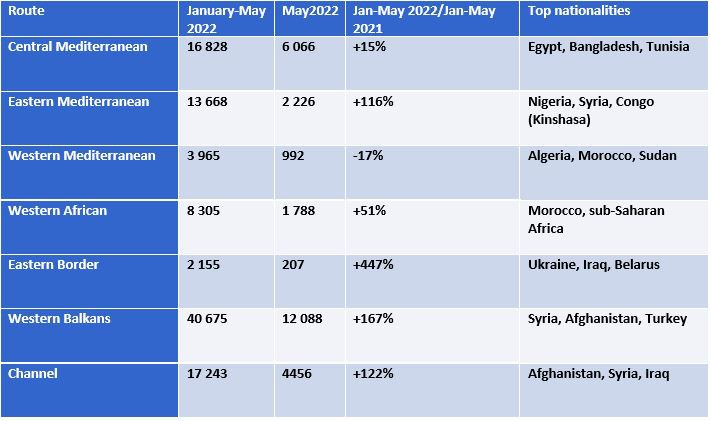 وقالت الوكالة إن الأشهر الخمسة الأولى من 2022 شهدت نشاطا كبيرا لحركة المهاجرين على طرق غرب البلقان ووسط وشرق البحر الأبيض المتوسط، المتجهين إلى دول الاتحاد الأوروبي.