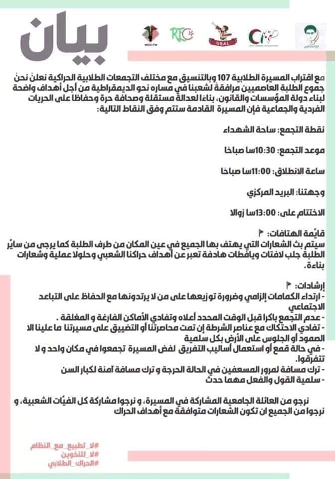 وشدّد الحراك الطلابي على ضرورة سلمية القول والفعل مهما حدث، داعين جميع الفئات الشعبية إلى المشاركة في المسيرة ورفع شعارات متوافقة مع أهداف الحراك الشعبي. كما أطلق البيان هاشتاغ “لا للتطبيع مع النظام” و”لا للتخوين”.