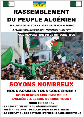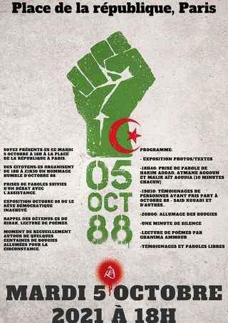 ودعا نشطاء ومناضلون من الجالية الجزائرية إلى تجمّع شعبي غدًا الإثنين، بساحة الفاتح نوفمبر وساحة تروكاديرو بباريس، لإحياء ذكرى 5 أكتوبر 1988 وللمطالبة