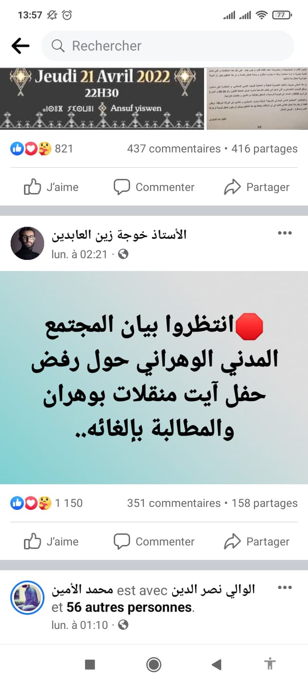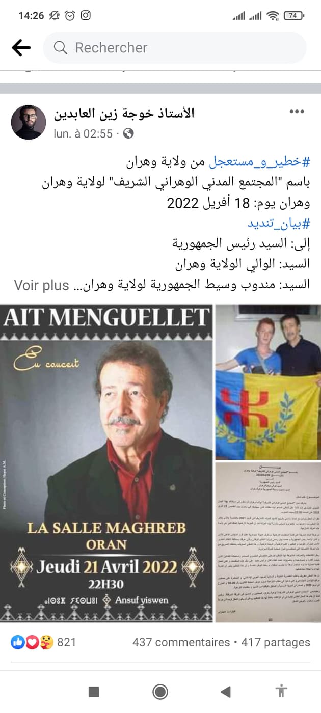 حيث تناقل مرشح سابق للإنتخابات البرلمانية، وناشط آخر ، قامت مصالح الأمن بمداهمة منزله وتوقيفه مع حجز حاسوبه بناءا على شكوى رفعتها ضده شهر فيفري المنصرم مديرة الثقافة لوهران على خلفية منشورات فايسبوكية، بيانا عبارة عن مراسلة، عبر صفحته بالفايسبوك باسم “المجتمع المدني الوهراني الشريف”، تحت عنوان “بيان تنديد”، كتب عليها أنها وجهت لكل من رئيس الجمهورية ووالي ولاية وهران ووسيط الجمهورية.وهي المراسلة التي حملت اتهامات خطيرة، لقيت إعادة نشر وتفاعل واسع من طرف رواد موقع الفايسبوك.وخاطب هذه الارسالية المتداولة تحت صيغة “الاستعجال والخطورة على الأمن الوطني”، المعنيين بالقول:” يشرفنا نحن المجتمع المدني الوهراني الشريف بولاية وهران أن نتقدم إلى سيادتكم بهذا البيان التنديدي التشاركي والذي يحمل صيغة الخطير والمستعجل للتدخل من اليوم إلى اليوم ضد إقامة حفل للمغني المدعو آیت منقلات” في وهران يوم الخميس 21 أفريل 2022 على الساعة 22:30 بسينما المغرب”
