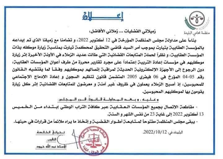 اعلن بيان، لمنظمة محامي البليدة، عن “مقاطعة الاتصال بجميع المؤسسات العقابية عبر كافة التراب الوطني ، إبتداءا من اليوم الخميس وألى غابة 23 من نفس الشهر والسنة”، وذلك بناءا على مداولة مجلس المنظمة المؤرخة في 12 أكتوبر الجاري.