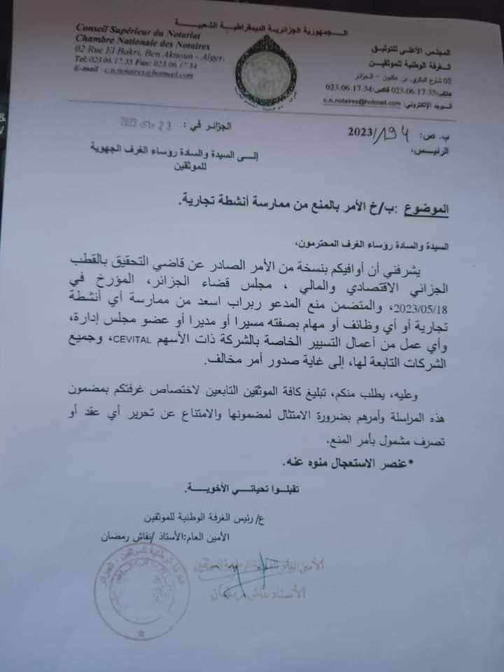 نداولت صفحات إعلامية في وسائل التواصل الاجتماعي برقية للغرفة الوطنية للموثقين، تتضمن تعليمة كتابية، لجميع الموثقين عبر 58 ولاية، تخطرهم بقرار قاضي التحقيق بالقطب الجزائي الاقتصادي والمالي التابع لمجلس قضاء الجزائر، بمنع رجل الأعمال يسعد ربراب من ممارسة أي نشاط يتعلق بمؤسسة “سيفيتال” التي يمتلكها.