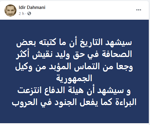 كتب ايدير دحماني على صفحته الفايسبوكية: سيشهد التاريخ أن ما كتبته بعض الصحافة في حق وليد نقيش أكثر وجعا من التماس المؤبد من وكيل الجمهورية.
