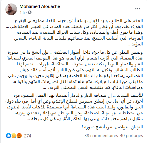 تأسّف مدير موقع “طريق نيوز” محمد لمين مغنين، تركيز وسائل إعلامية في كتاباتها عن حيثيات قضية وليد نقيش على لائحة الاتهامات، دون أن تأخذ بعين الاعتبار أقوال وليد نقيش، ثمّ أدانته في مقالات صحفية قبل صدور الحكم.