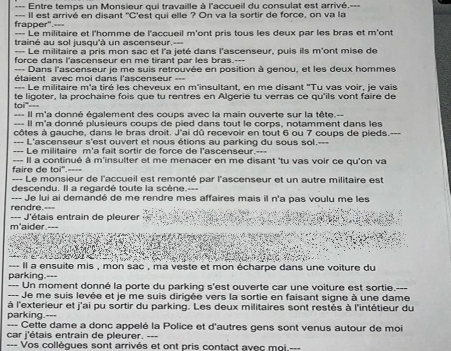 موظّف آخر اقترب مني وقال لي: تعتقدون أنّ القنصلية وكالة بنكية وأضاف: لماذا تأتون إلى فرنسا؟ أجبته بأنني أريد مقابلة القنصل وذلك من حقي مثلما هو الحال مع باقي الجزائريين. ليخبرني أنّ القنصل لن يستقبلني أبداً. أصررتُ على مُقابلة القنصل، هنا جاء موظّف استقبال وطلب من رئيس مصلحة الأمن بإخراجي بالقوة. أخذوني بالقوة من ذراعي ورموا أغراضي في المصعد، رئيس مصلحة الأمن أخذني بالقوة ركلني وضربني.