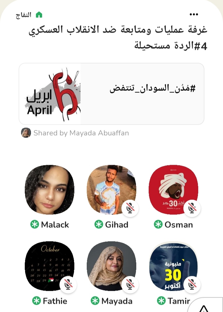 Sur le réseau social Clubhouse, une room intitulée « la chambre des opérations et de suivi contre le coup d’Etat militaire, l’apostasie est impossible » est en cours depuis le début du coup d’Etat militaire du 25 octobre 2021. Les participants organisent et suivent de près le développement des évènements sur le terrain.