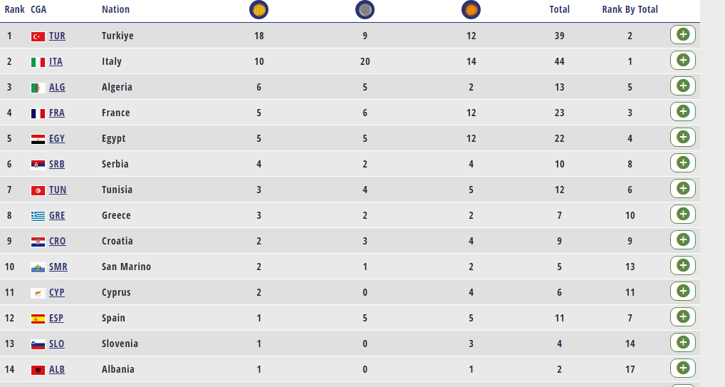 La Turquie continue de dominer la 19e édition des jeux méditerranéens avec 18 médailles d’or et un total de 39 médailles, derrière l’Italie qui a récolté un total de 44 médailles.