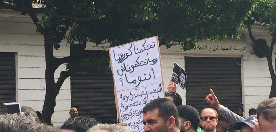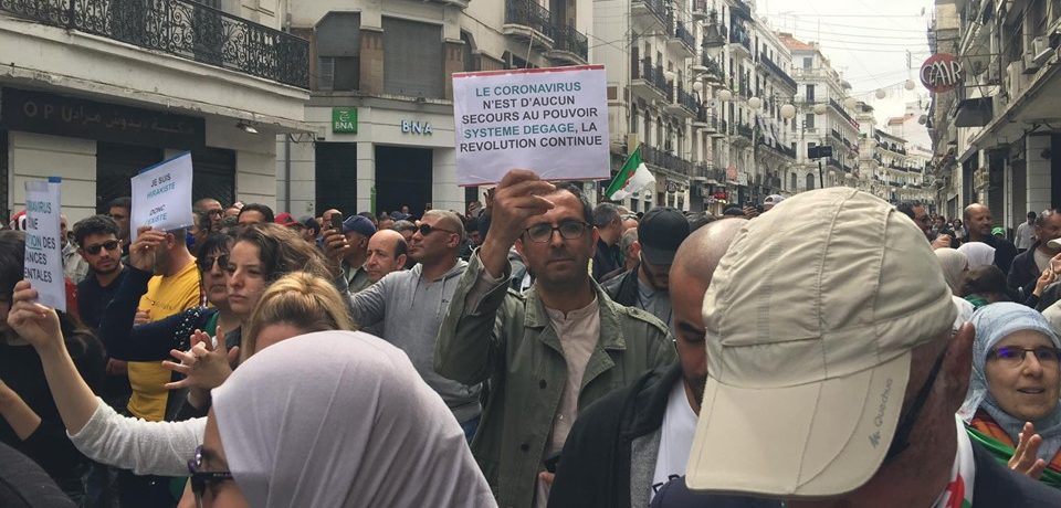 Militants, activistes et citoyens étaient au rendez-vous du 56ème vendredi du Hirak qui persiste à réclamer un changement de régime. Les craintes liées à la propagation du virus Covid-19 ne semblent pas altérer la mobilisation citoyenne contre le système. L’inquiétude est cependant palpable, le danger du coronavirus est sur toutes les lèvres. Mais les avis restent contrastés. Certaines pancartes ont appelé à suspendre les suspension des rassemblements jusqu’à nouvel ordre, d’autres s’amusaient à évoquer la situation avec dérision.