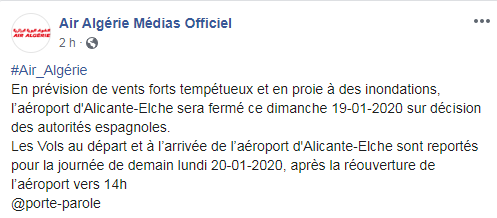 La compagnie aérienne air Algérie a annoncé ce dimanche 19 janvier, que les vols au départ et à l’arrivée de l’aéroport d’Alicante-Elche sont reportés pour la journée de demain lundi 20-01-2020.