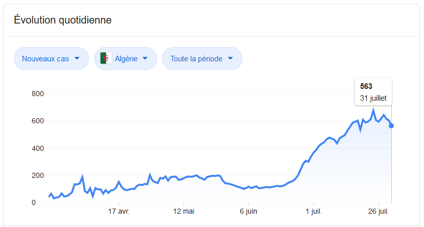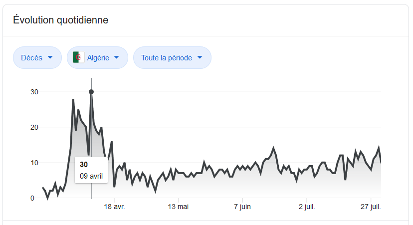 Arithmétique froide, que disent les chiffres avancés par les autorités officielles et frappés du label «chiffres officiels» ? D’abord que l’ascension de la courbe s’est opérée à partir du 19 juin (119 nouveaux cas de contamination) pour aller crescendo jusqu’à atteindre plus de 600 cas de nouvelles contaminations les 24 et 28 juillet. Doit-on incriminer l’Aïd El Fitr dans l’apparition de cette nouvelle courbe? Rien n’est moins sûr ! Par contre une certitude: on fait de plus en plus de tests. On est loin des 60 tests/jour réalisés uniquement à l’institut Pasteur d’Alger. Et c’est en juin justement que le Pr Derrar, DG de l’IPA a fait savoir que 2500 tests de dépistage du Covid-19 par jour étaient réalisés à travers les différentes régions du pays. Si l’on fait plus de tests, ne faudrait-il pas s’attendre à plus de cas? Laquelle proportion de cas qui a certainement toujours existé depuis au moins la mi-avril, mais ignorée parce que non détectée, mais que conforte d’autres chiffres sur lesquels, étrangement, on communique peu: ceux des décès, restés selon une courbe en plateau oscillant entre 8 et 14 décès par jour. Les deux seuls exceptions ont eu lieu début avril, avec 28 et 30 morts, respectivement les 2 et 8 avril.