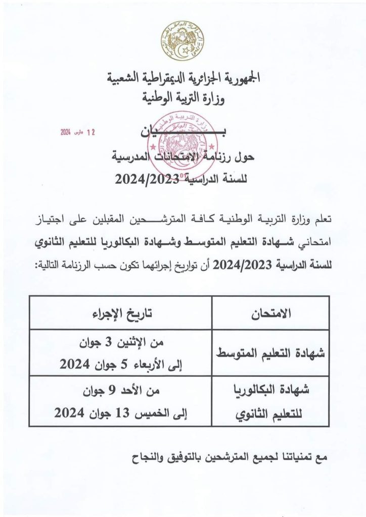 « Le ministère de l’Education nationale informe les candidats au Brevet d’enseignement moyen (BEM) et au Baccalauréat pour l’année scolaire 2023/2024, que les dates des épreuves ont été fixées comme suit : Les épreuves du BEM se dérouleront du lundi 3 juin au mercredi 5 juin 2024. Les épreuves du Baccalauréat se dérouleront de dimanche 9 juin au jeudi 13 juin 2024 », a précisé le communiqué.