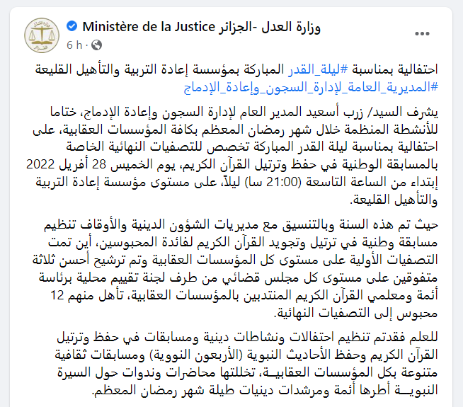 Sur sa page facebook, le ministère de la justice communique pourtant sur la célébration de la nuit du Destin, par l’organisation de la finale des récitants du Coran à la prison de Koléa, celle-là même qui a vu mourir Hakim Debbazi. Une publication qui a soulevé le courroux de nombreux internautes.
