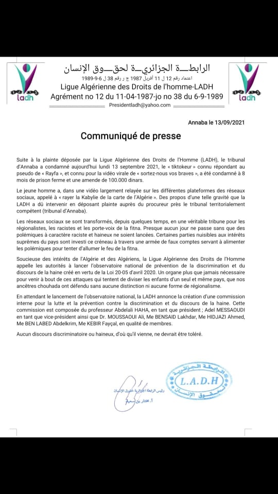 “Le jeune homme a, dans une vidéo largement relayée sur les différentes plateformes des réseaux sociaux, appelé à « rayer la Kabylie de la carte de l’Algérie ». Des propos d’une telle gravité que la LADH a dû intervenir en déposant plainte auprès du procureur près le tribunal territorialement compétent (tribunal d’Annaba).” Rappelle la LADH dans son communiqué.