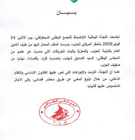 Réagissant à son exclusion du parti, le concerné a qualifié la décision de « nulle et non avenue ». Selon lui, la réunion de la commission de discipline est illégale car décidée par un secrétaire général par intérim qui n’est pas habilité à le faire « compte tenu de l’article 33 des statuts du parti et l’article 139 du règlement intérieur ». D’après lui, le secrétaire général par intérim est chargé uniquement de préparer le congrès extraordinaire du parti. Le prochain congrès est prévu le 18 et 19 mars 2020 à Alger. « Dès l’installation du comité de préparation du congrès, toutes les structures du parti sont annulées. Donc, la réunion de la commission de discipline est non organique. Je n’ai reçu aucune convocation de quelque partie que ce soit et je n’ai commis aucune violation. Il faut savoir que la commission de discipline du RND ne s’est jamais réunie selon les conditions légales lui permettant de prendre ce genre de décisions », a soutenu Seddik Chihab.