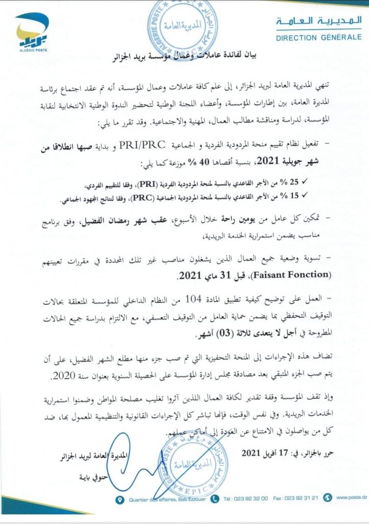 L’Algérie Poste a également annoncé deux jours de repos pour tous les employés, et ce après la fin du mois de Ramadhan, la régularisation du statut des employés exerçant des fonctions non inscrites dans leurs contrats, et ce avant 31 mai 2021 et traiter les cas des employés suspendus dans un délai n’excédant pas les trois mois.