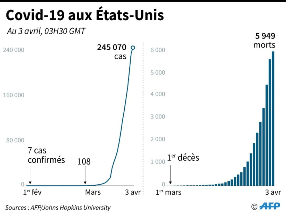 Après 1.480 morts en une journée, bilan quotidien le plus élevé jamais enregistré dans un seul pays, les Américains se préparent au pire et bâtissent des hôpitaux de campagne de Los Angeles à Miami, avec des milliers de lits supplémentaires de réanimation. Le navire-hôpital Comfort, d’une capacité de 1.000 lits et arrivé lundi à New York, a accueilli vendredi ses premiers malades.