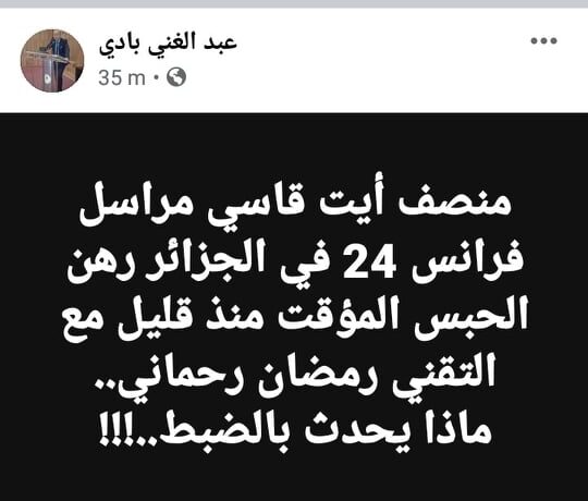 Le journaliste algérien et correspondant de la chaîne d’information en continu France 24, Moncef Ait Kaci, a été placé sous mandat de depôt ce mardi 28 juillet par le juge d’instruction près le tribunal de Bir Mourad Rais par le, en compagnie d’un technicien dénommé Ramdhan Rahmani, a-t-on appris auprès de l’avocat Abdelghani Badi via sa page Facebook et le site “l’Info”.