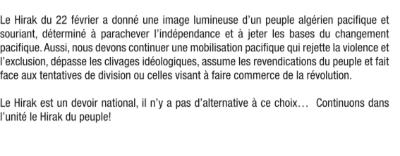 Le mot d’ordre “Khawa-Khawa” renferme la notion d’une fraternité active qui libère les énergies. ” … les Algériens ont démontré, malgré toutes les manipulations et toutes les manœuvres, que la diversité est richesse et construction et non exclusion et menace. Ils ont montré avec éclat, malgré la répression et le black-out médiatique, qu’ils forment une nation unie et qu’ils sont fiers de leur diversité, leur richesse. La diversité active au sein du Hirak confirme, sans l’ombre d’un doute, que la société est en avance sur le pouvoir en place et sur les élites qui le soutiennent. En une année, l’élan populaire pacifique a balayé des décennies de propagande vicieuse, de fabrication de fausses menaces à l’unité nationale et de visions partiales et tronquées de l’histoire du pays”
