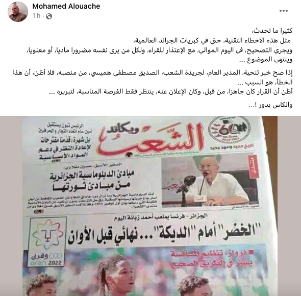 En effet, le ministère de la Communication a annoncé jeudi dans un communiqué la fin de fonctions du Directeur général du journal “EL Chaâb” Mustapha Hamici, « pour avoir commis une faute grave », mais sans donner de détails de cette décision ni la nature de cette « faute » qualifiée de « grave ».