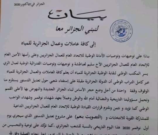 C’est l’exemple de la section UGTA (Union générale des travailleurs algériens) de l’Algérienne des eaux d’Alger. En effet, dans un communiqué adressé à l’ensemble du personnel de l’entreprise publique ADE (Algérienne des Eaux), le secrétariat général de l’UGTA avec à sa tête Salim Labatcha, qui sans y passer par quatre chemins, donne une de vote en faveur du “OUI”.