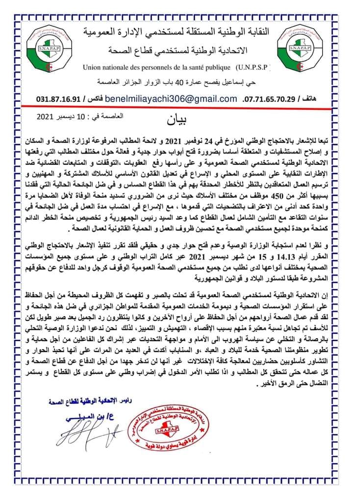 Parmi les revendication cité dans le communiqué du UNPSP, “la levée des sanctions, des licenciements et poursuites judiciaires contre les syndicalistes au niveau locale, mais aussi régularisation de la situation des contractuels qui encours des danger à cause la pandémie du Covid-19”.