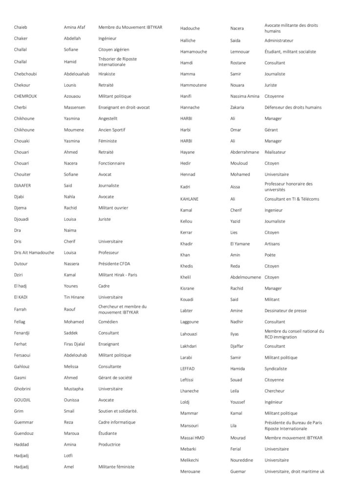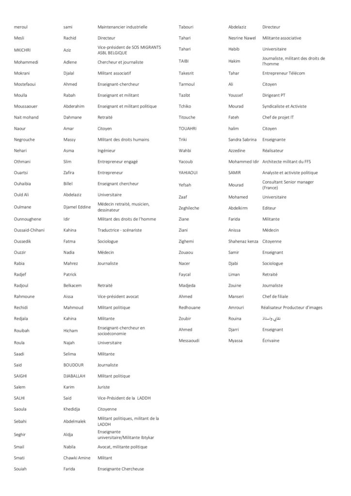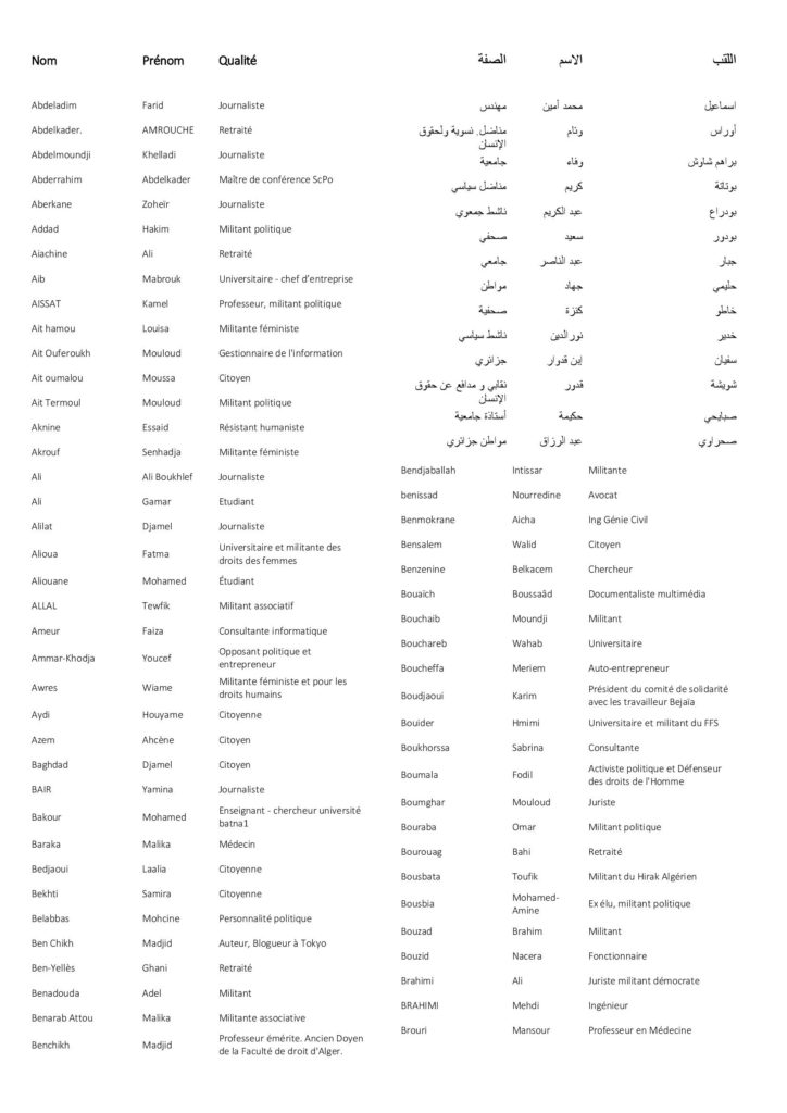Les premiers signataires invitent également les Algériens « à revendiquer et à agir pour la révision des textes juridiques liberticides pour les mettre en conformité avec les engagements conventionnels de l’Algérie en matière des droits de l’homme ».