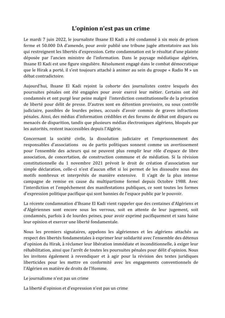 « La récente condamnation d’Ihsane El Kadi vient rappeler que des centaines d’Algériens et d’Algériennes sont encore sous les verrous, soit en attente de leur jugement, soit condamnés, parfois à de lourdes peines, pour avoir exprimé pacifiquement et sans haine leur opinion et exercer une liberté fondamentale » affirme le texte de la pétition.